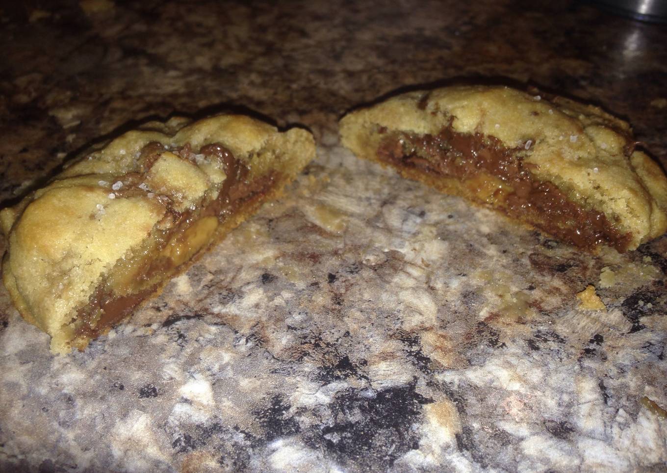 brown butter sea salt chocolate chip cookies stuffed with nutella and dulce de leche