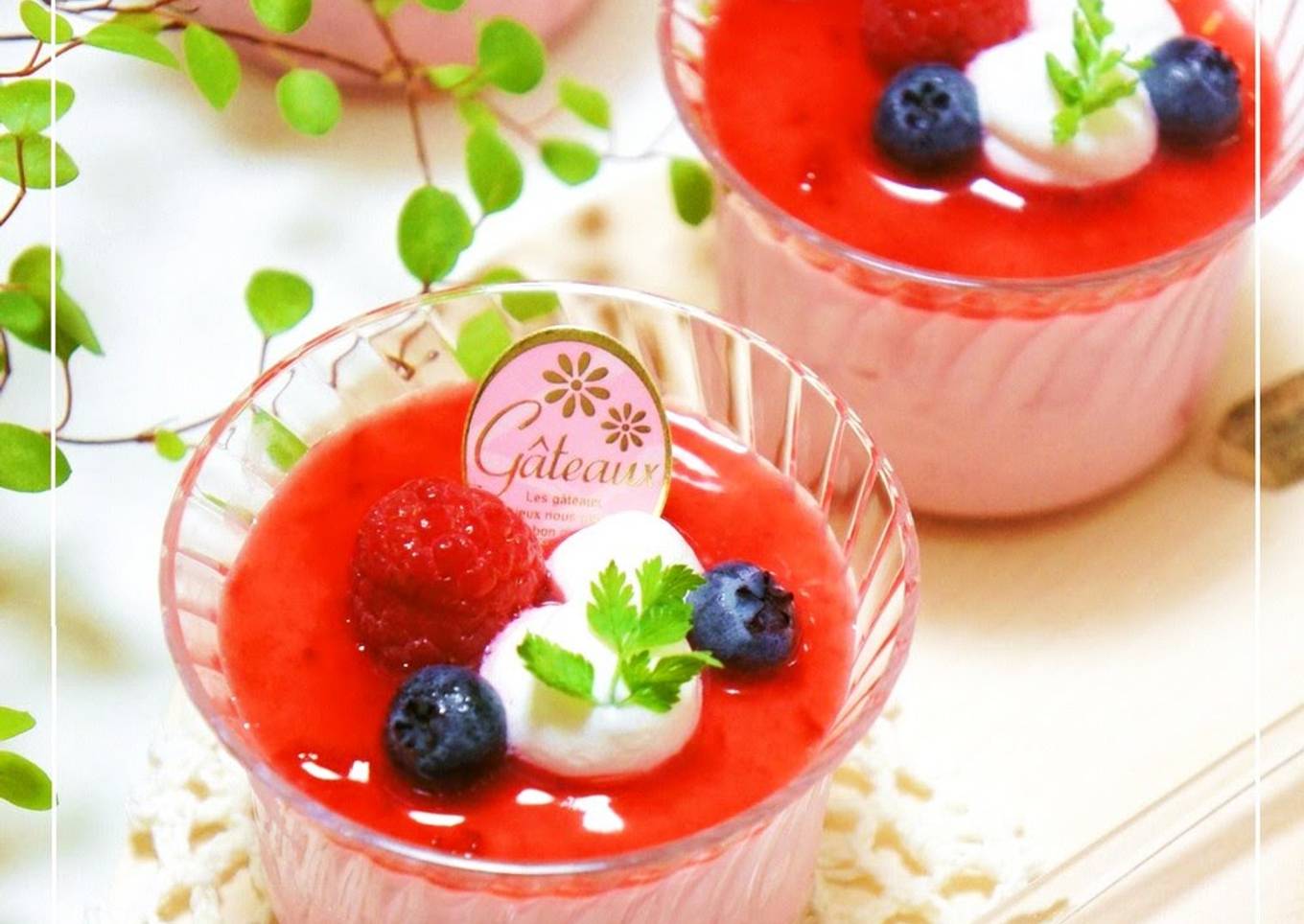- Note: The sauce in the photo is 20 g of frozen raspberries, 10 g of sugar, and 30 g of hot water, all mixed together, mashed, and filtered, then combined with 1 g of gelatin.