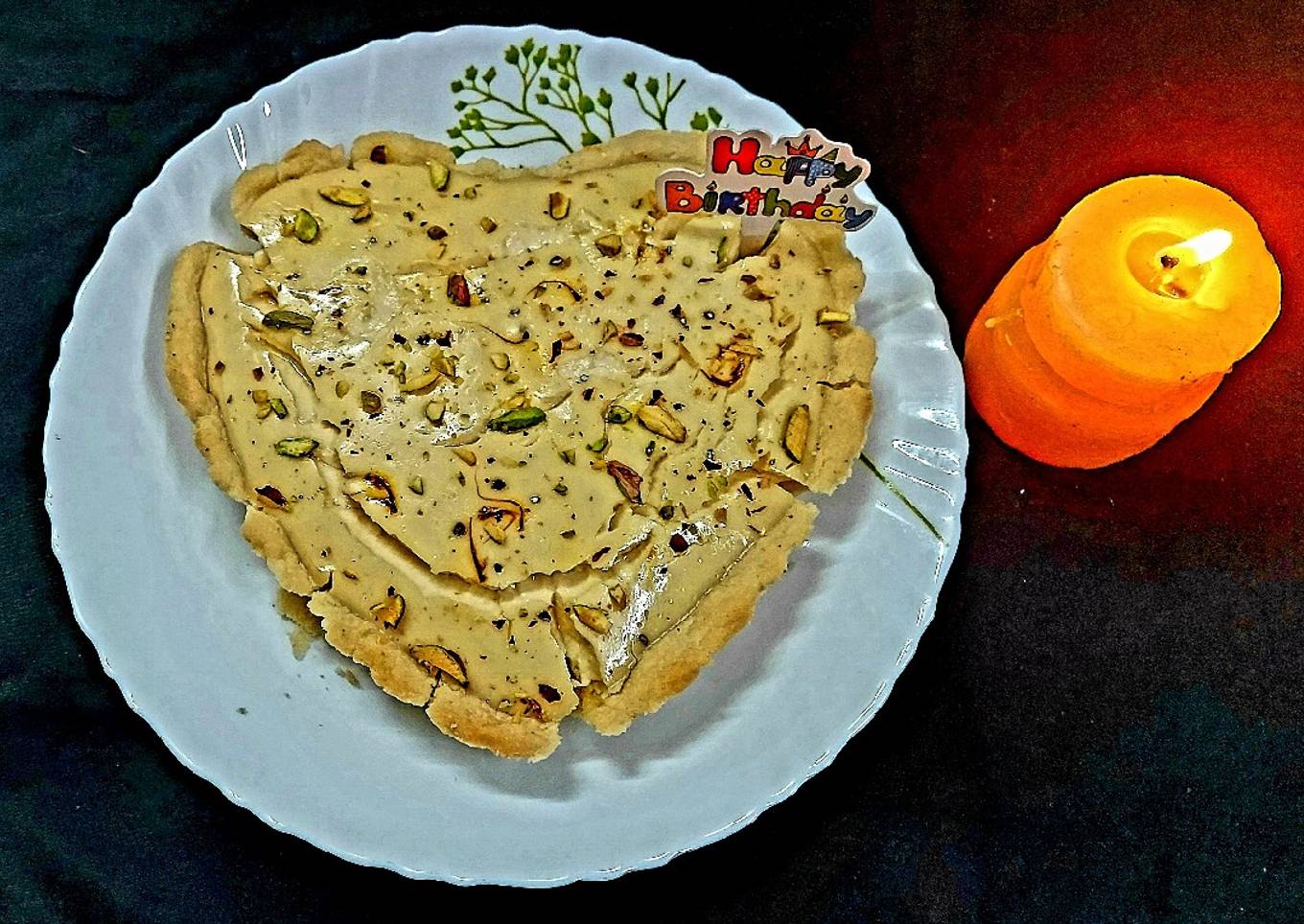 - Preheat oven n baked on 160* temp for 25-30 mins. Take out pie dish from oven garnish with crushed cardamom and chopped pistachio. Baked Yoghut Tart is ready. Keep in a fridge to chill.4-5 hours.