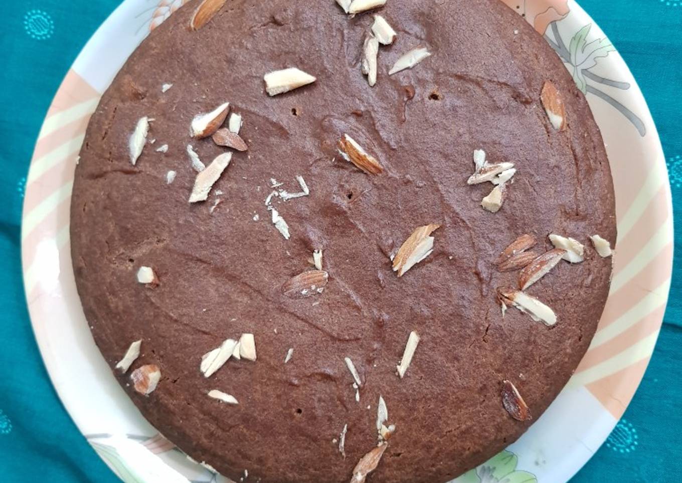 - Pour in a greased and dusted cake pan. Tap twice to remove air bubbles. Garnish with almonds.