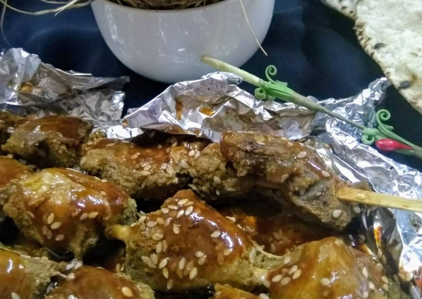 - Take a aluminium foil piece and place boti on it....brush the sauce gradually on botis and leave 1 and 1/2 tbs sauce for using later.....