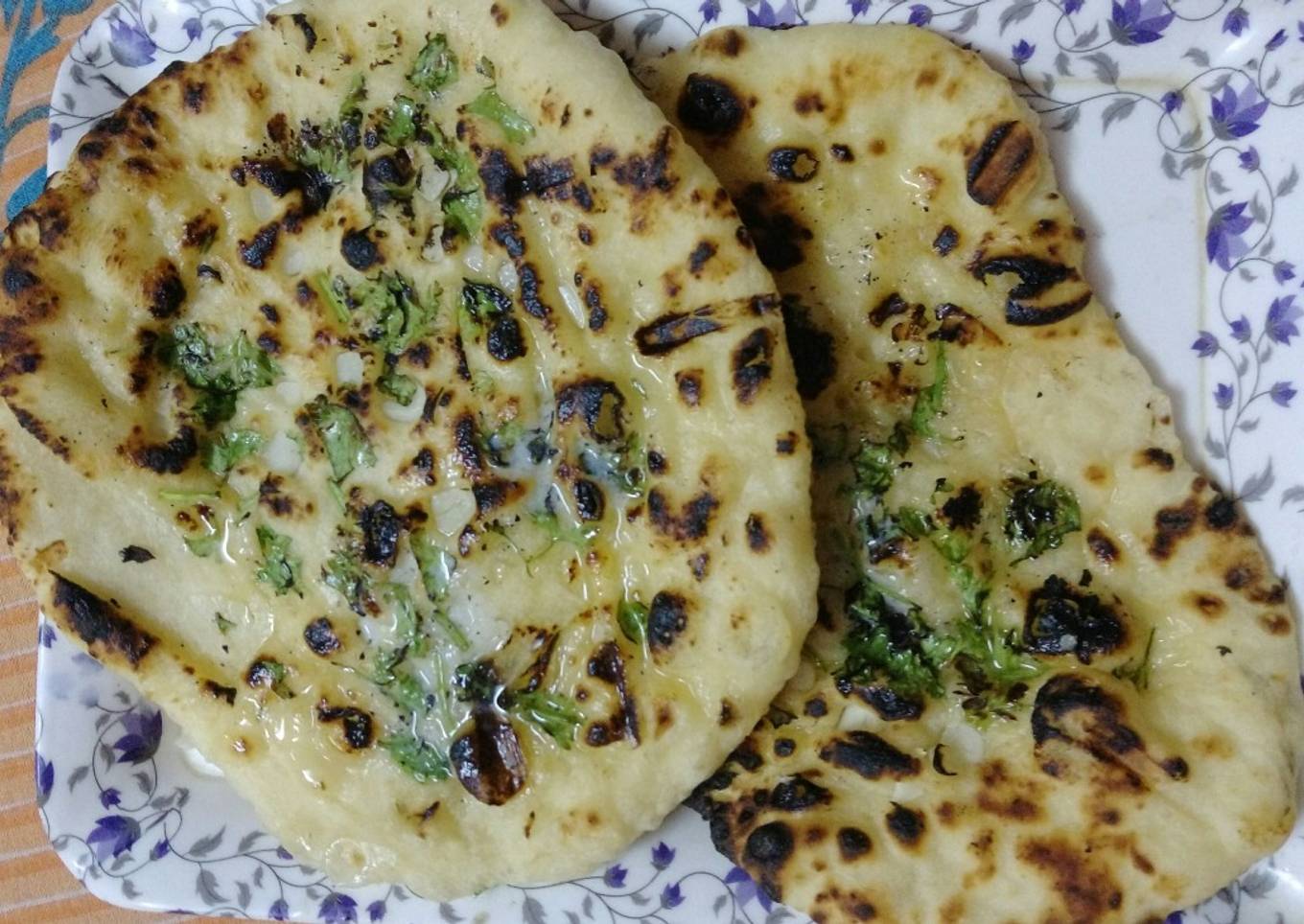 - Add finly chopped garlic and chopped Coriander on the middle of the nun and press it with finger tips.