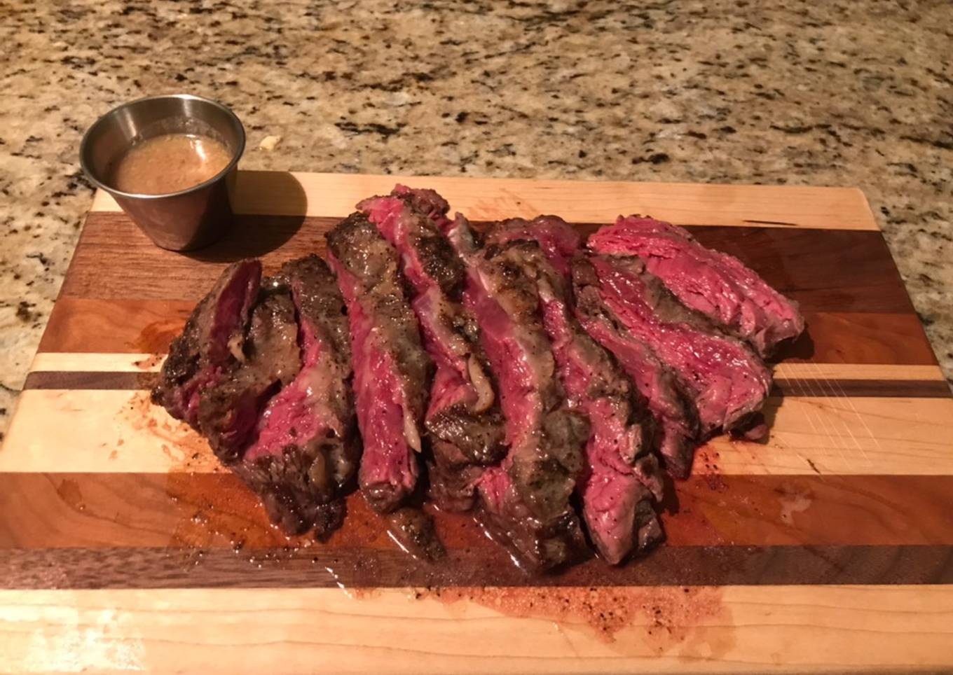 - Slather the steak with the butter and tent with foil and allow to rest. Put the steak on a cutting board and slice. Pour the reserved juices from what it was resting in into a ramekin and mix well to form a sauce and drizzle over the sliced steak or serve on the side.